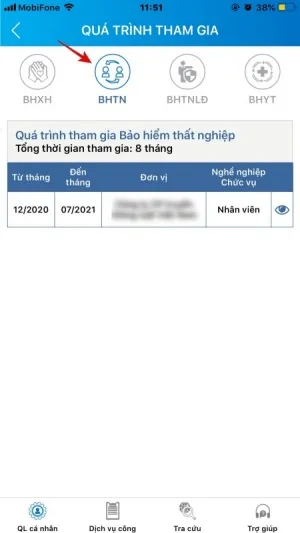 Bước 3: Chọn “BHTN” để xem quá trình đóng bảo hiểm thất nghiệp.