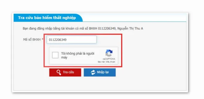 Bước 2: Điền chính xác Mã số BHXH và tích chọn vào ô “Tôi không phải người máy” để xác minh thông tin.