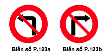 Để báo cấm rẽ trái hoặc rẽ phải (theo hướng mũi tên chỉ) ở những vị trí đường giao nhau, đặt biển số P.123a “Cấm rẽ trái” hoặc biển số P.123b “Cấm rẽ phải”. Biển không có giá trị cấm quay đầu xe.